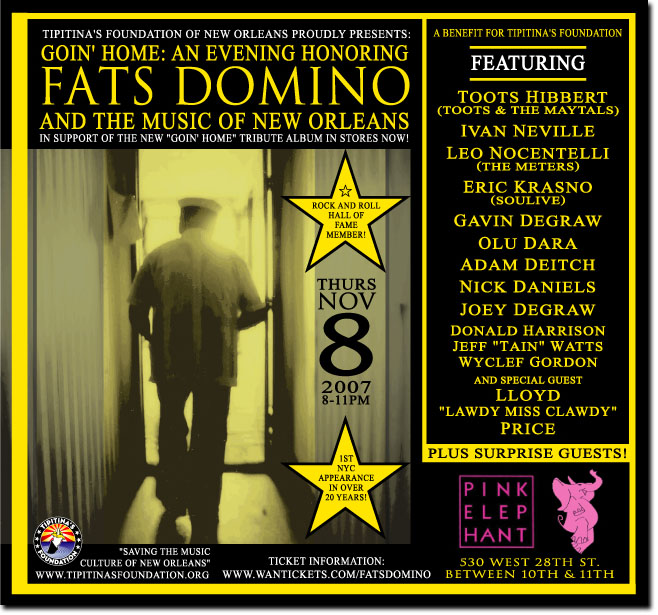 Fats will not only be a guest on "Late Show with David Letterman" on CBS-TV November 8, he will also be making his first New York City appearance since 1992, at the Pink Elephant. See the promo ad. This will also be his first time out of Louisiana since 1995. Apart from a couple of shows just across the Louisiana border in Mississippi.